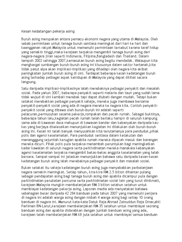 Kesan Kemasukan Pendatang Asing Tanpa Izin from imgv2-1-f.scribdassets.com Pendatang asing dapat dikategori kepada dua kelompok iaitu pendatang asing yang sah dan pendatang asing tanpa izin(pati). Inilah kesanya bila masalah pendatang asing sabah tidak dibanteras sehingga jumlah mereka semakin ramai. Contoh karangan masalah kedatangan pendatang asing di negara kita. Pendatang asing adalah kedatangan sekumpulan manusia atau seseorang dari sesuatu negara ke negara lain dengan tujuan khusus. Membangunkan ekonomi negara, namun terdapat beberapa kesan negatif apabila pekerja asing masuk ke negara kita secara tidak terkawal. Jabatan agama juga seolah tidak berminat untuk campur tangan dalam soal ini. Sebagai penutup wacana, tegas bahawa kedatangan buruh asing memberikan implikasi positif dan negatif kepada negara kita. Sebagai hasilnya, wujudlah peluang pekerjaan yang meluas dan timbul masalah kekurangan tenaga kerja.